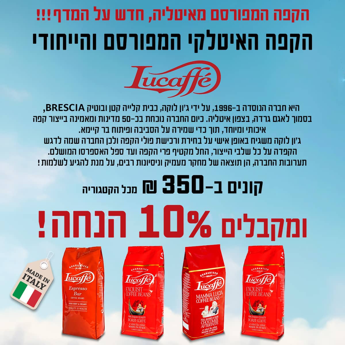 קונים פולי קפה מכל המותגים והתערובות במארזי 1 ק"ג, ב-350 ש"ח ומקבלים 5% הנחה אוטומטית בקופה על הקפה שבחרתם. (לא כולל מארזים ובאנדלים)